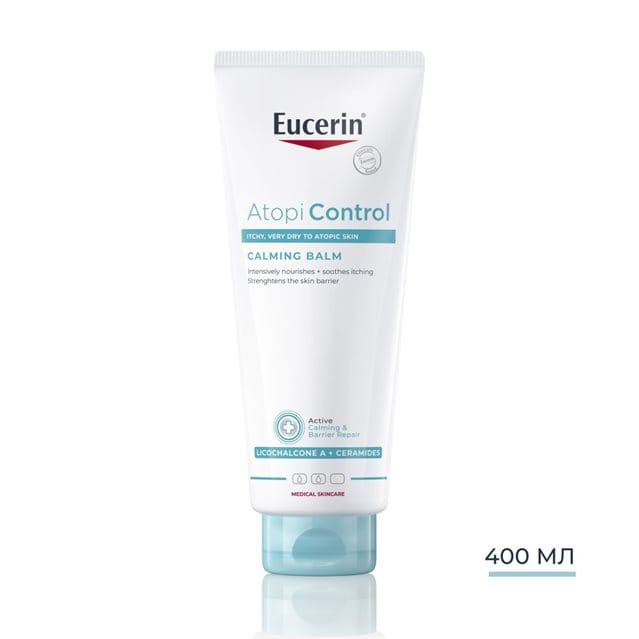 Eucerin AtopiControl Успокояващ балсам е подходящ за ежедневна употреба продукт, специално разработен да облекчава и хидратира в дълбочина раздразнителна и сърбяща кожа. Лекият, но подхранващ балсам масло-във-вода е обогатен с успокояващи Ликохалкон А, Серамиди и масло от Ший с цел да се заздрави кожната бариера и да се успокои сухотата и сърбежът. Той може да се използва по време на обостряне в комбинация с Eucerin AtopiControl Интензивен успокояващ крем, Eucerin Спрей при сърбеж и вашите обичайни лекарства. Балсамът за атопична кожа предоставя незабавна хидратация, която умекотява и изглажда кожата и, при редовна употреба, видимо подобрява състоянието на кожата.