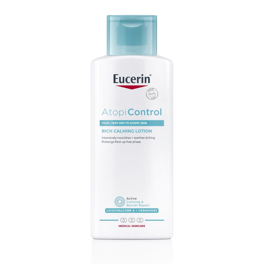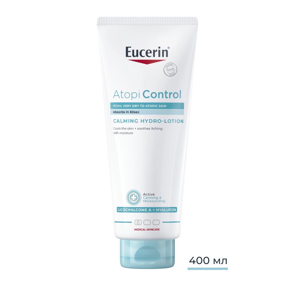 Eucerin AtopiControl Calming Hydro-Lotion е ежедневна грижа за тялото, която е специално разработена за успокояване и интензивно овлажняване на раздразнената и сърбяща кожа. Комбинацията му от ликохалкон А, хиалуронова киселина и керамиди предлага бързодействащо облекчение, успокоява сърбящата и склонна към екземи кожа и осигурява дълготраен комфорт на кожата. При редовно нанасяне състоянието на кожата забележимо се подобрява с повече мекота и гладко усещане.