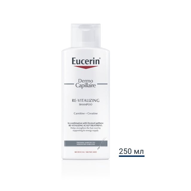 Eucerin DermoCapillaire Ревитализиращ шампоан е специално разработен, за да подготви скалпа ви за и да спомогне действието на Eucerin DermoCapillaire Ревитализиращ тоник за скалп. Продуктите Eucerin DermoCapillaire за ревитализираща грижа са клинично и дерматологично доказани да заздравяват на корените на косата.