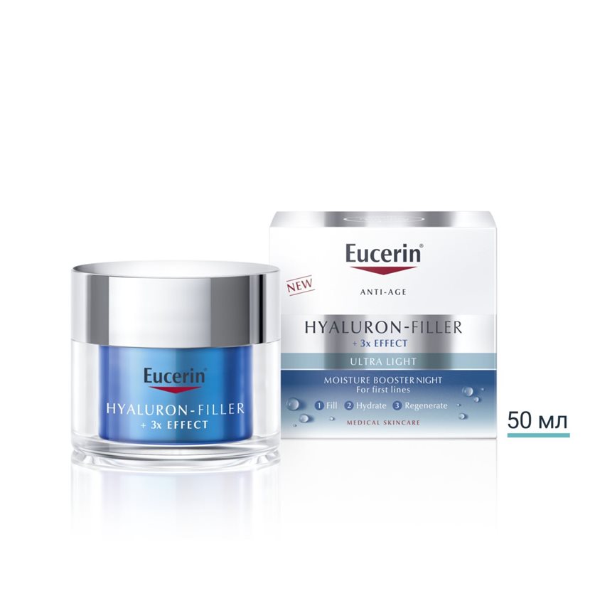 Eucerin Hyaluron-Filler +3x ЕФЕКТ Хидратиращ нощен крем дава на кожата незабавна и интензивна хидратация и повишава хидратацията на кожата до 72 часа.