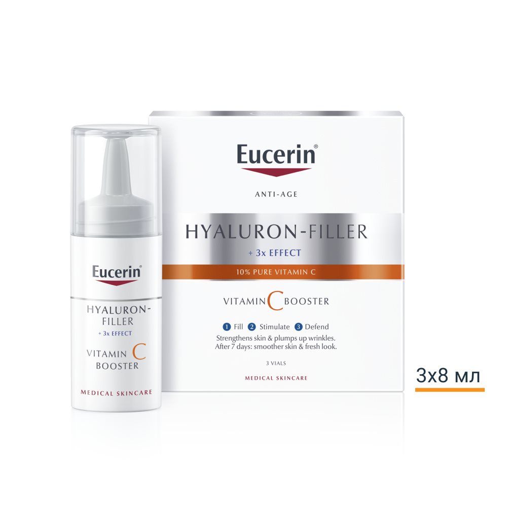 Eucerin Hyaluron-Filler Vitamin C Booster използва антиоксидантното и стимулиращо производството на колаген действие на 10% чист и активен Vitamin C. Той също съдържа хиалуронова киселина с ниско молекулярно тегло и доказано в клинични и дерматологични проучвания подсилва кожата, запълва бръчките и придава по-гладък, свеж и сияен вид на кожата след само седем дни, като резултатите се подобряват с течение на времето. Може да се използва самостоятелно за справяне с първите признаци на стареене, макар че препоръчваме използването му в комбинация с дневни кремове от серията Eucerin Hyaluron-Filler, като например: Eucerin Hyaluron-Filler Дневен крем със SPF 15 или Eucerin Hyaluron-Filler Дневен крем със SPF 30.