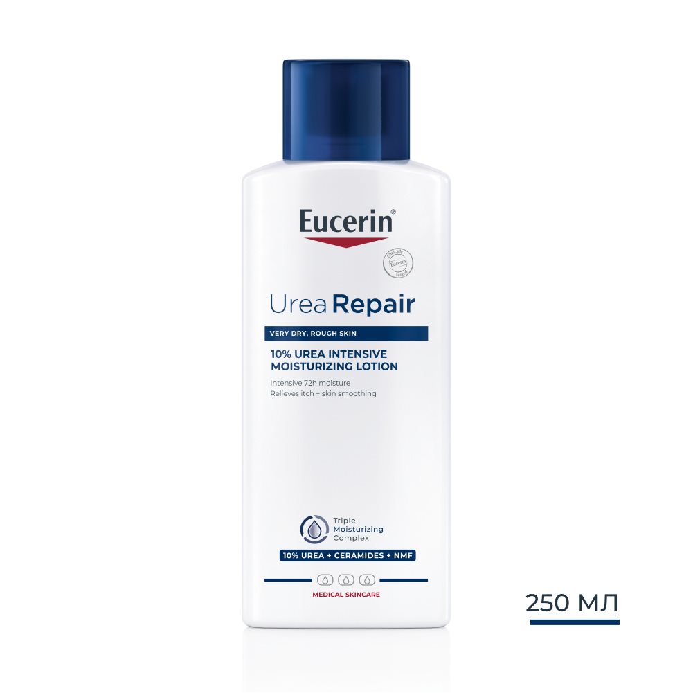 Eucerin UreaRepair PLUS Интензивен лосион за тяло с 10% Уреа съдържа уреа и други NMFs (за задържане на вода в кожата) и серамиди (за възстановяване на бариерата на кожата и намаляване на загубата на хидратация). Формулата осигурява незабавно облекчение и забавя симптомите на много сухата кожа (като груба повърхност и лющене) с до 48 часа.