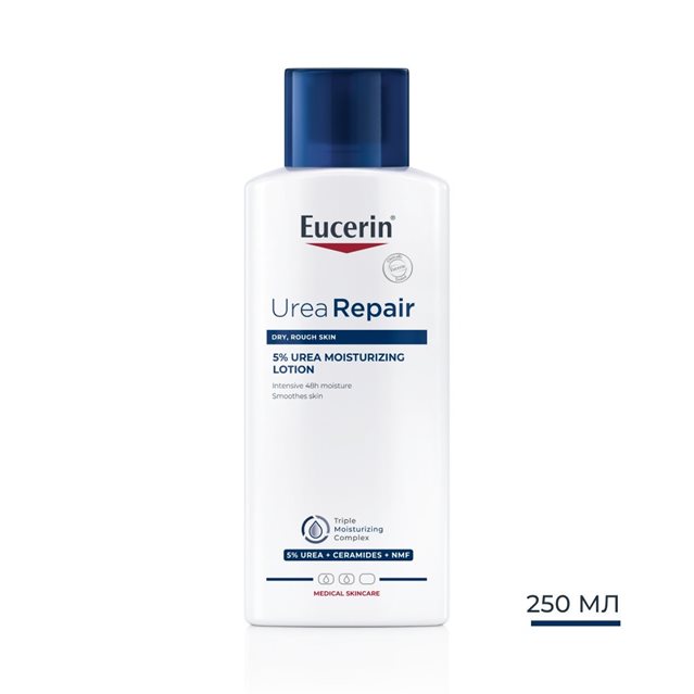 UreaRepair Лосион за тяло с 5% урея с уникална формула с троен хидратиращ комплекс за незабавно облекчаване на признаците на груба, много суха кожа: грапавост, сърбеж чувство на обтегнатост. Интензивна хидратация до 48 часа и защитава естествената кожна бариера.